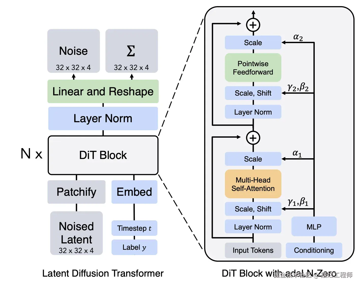 DiT(Diffusion in Transformers)结构是将transformer和**DDPM(Diffusion Models)**结合在一起的模型。简单来说,它使用transformer结构替换了稳定扩散中的U-Net结构,用于噪声去除。这种替换带来了以下优势: