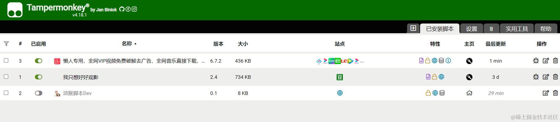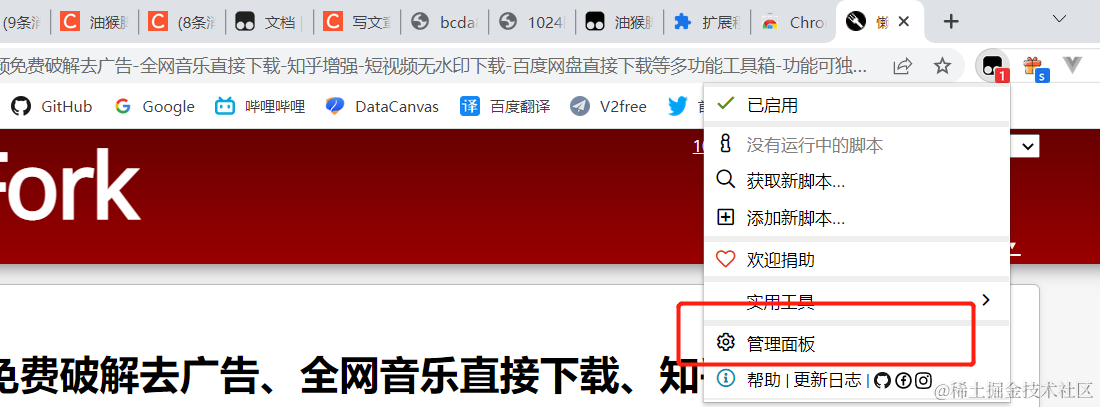 你就能够通过点击油猴脚本那个图标,再进入到管理面板就能够看到你安装的脚本了: