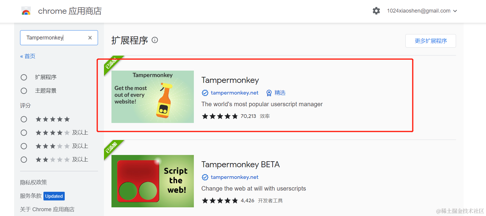 访问谷歌应用商店之后,搜索油猴脚本的英文名:Tampermonkey 进行下载
