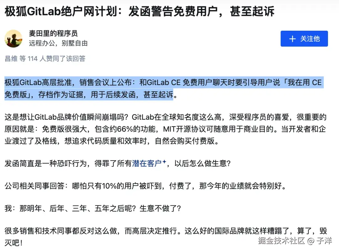 就在今天早上,极狐 GitLab 的 “绝户网计划” 也浮出水面。据爆料,极狐 GitLab 要求销售人员在与使用 GitLab CE(社区版)免费版的用户交流时,引导用户明确表达正在使用免费版,并将此作为证据存档,以便未来可能的发函或起诉。 从其告知函来看,极狐 GitLab 强调其核心产品 GitLab 受法律保护,指出用户涉嫌未经授权使用软件,违反相关法律法规。公司内部对此计划也存在分歧,部分销售和技术同事反对,认为这会得罪潜在客户,影响长期生意,但公司高层却决定推行,寄希望于小部分害怕被起诉的用户付费来提升今年业绩。此计划引发了广泛争议,因为 GitLab 的免费版在全球范围内被大量程序员使用,且一直以来被认为是可商用的,这一举措无疑打破了以往的认知,让许多用户感到不满和担忧。