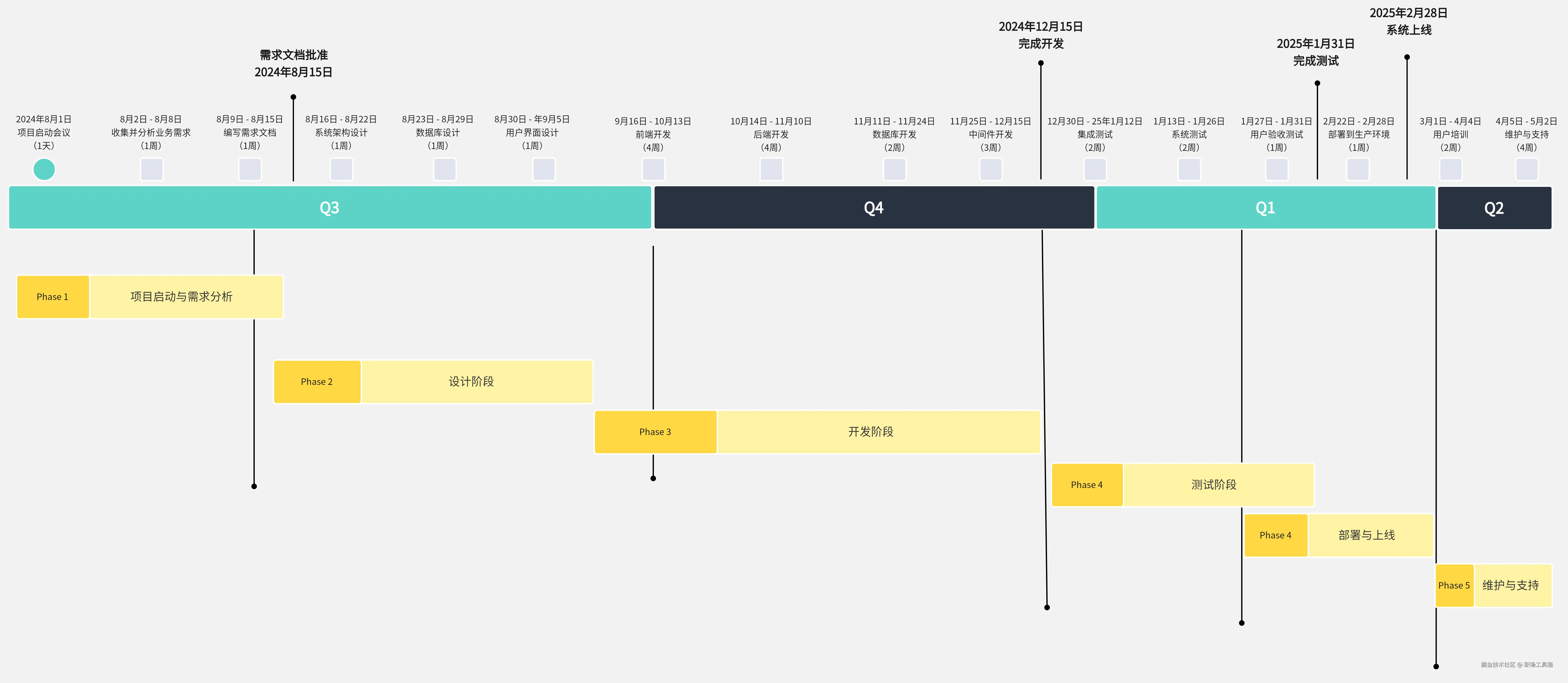 - 时间线:也叫时间轴,是一种线性排列的图形表示,通常用于展示项目中各个事件、任务和里程碑在时间上的顺序和分布。它可以帮助项目管理者和团队成员快速了解项目的整体进度和关键节点。