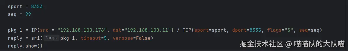 解决windows下scapy发送syn包被rst的问题 喵喵队的大队喵 2024-12-10 105 阅读1分钟 开启windows防火墙即可去除rst 未开启Windows防火墙: Python发送syn包代码 Wireshark抓包,可以发现被客户机无情rst 开启Windows防火墙: 一切正常