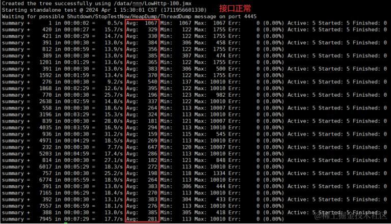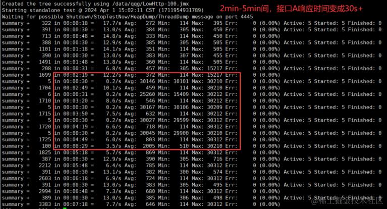 接口A:通过Jmeter发起请求,接口A响应一直为100ms,但是接口B在2min-5min系统异常响应缓慢,影响接口A,压测7min的压测记录如下: