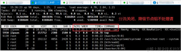 同时,观察高延迟节点组的资源消耗情况。压测0-2min时,接口A和接口B正常,请求都在共享组执行,高延迟节点不处理请求,无资源消耗,如下: