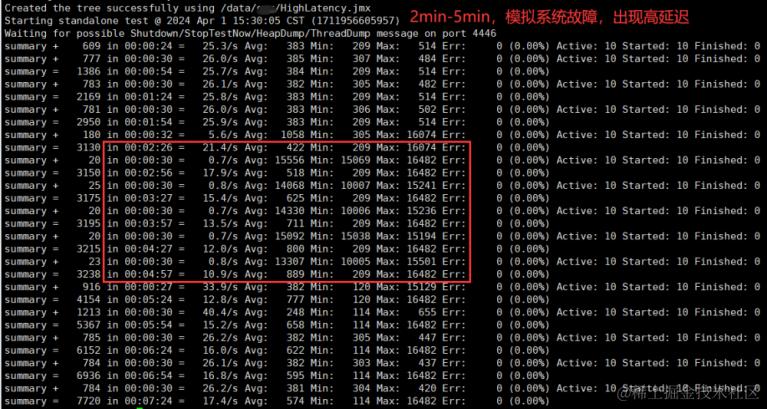 接口B:通过Jmeter发起请求,在0-2min时接口正常响应;在2min-5min时模拟系统故障出现高延迟15s;在5min后系统正常,压测7min的压测记录如下: