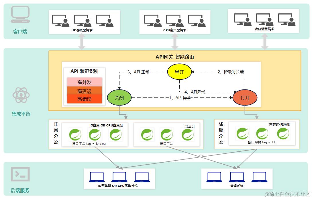 在实际生产中,API调用会突发出现高并发、高延迟、高错误的情况,这些情况无法预知,因此,需要在出现突发情况时,智能识别异常API,并做出相应处理,智能分流方案应运而生。
