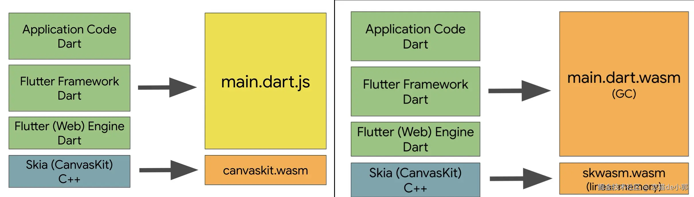 本次合并调整之后,Flutter Web 只提供了两个渲染器支持,分别是 default 和 WebAssembly,对应 CanvasKit 和 SkWasm。