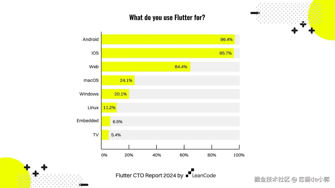 最后,在 Flutter CTO 2024 的报告显示,目前 Flutter 用户除了 Android 和 iOS 外,排第三的是 Web ,所以整体上 Flutter 对于 Web 还是比较上心的,而 HTML 的正式移除,明确了 Web 后续的路:坚定不移的 Wasm 。