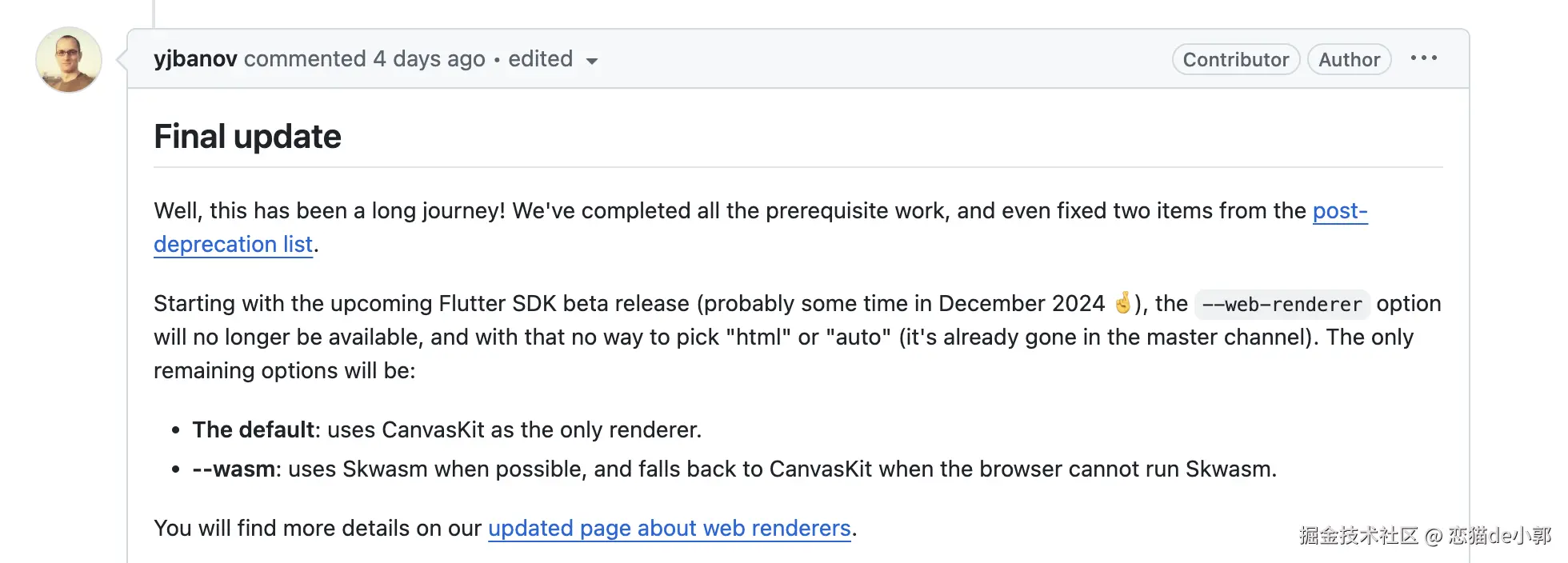 关于这个话题其实聊过很多次,在 2023 年初的时候,谷歌就提出了调整 Flutter Web 路线的方向,而今年年初的时候,Flutter 官方也正式官宣弃用 HTML renderer 的计划,而近日,在 #145954 的 Final update 里提到,大概在今年 12 月该功能将正式合并到 beta 版本,届时 --web-renderer 选项将不再可用, Flutter Web 将只支持默认的 CanvasKit 和全新的 SkWasm。