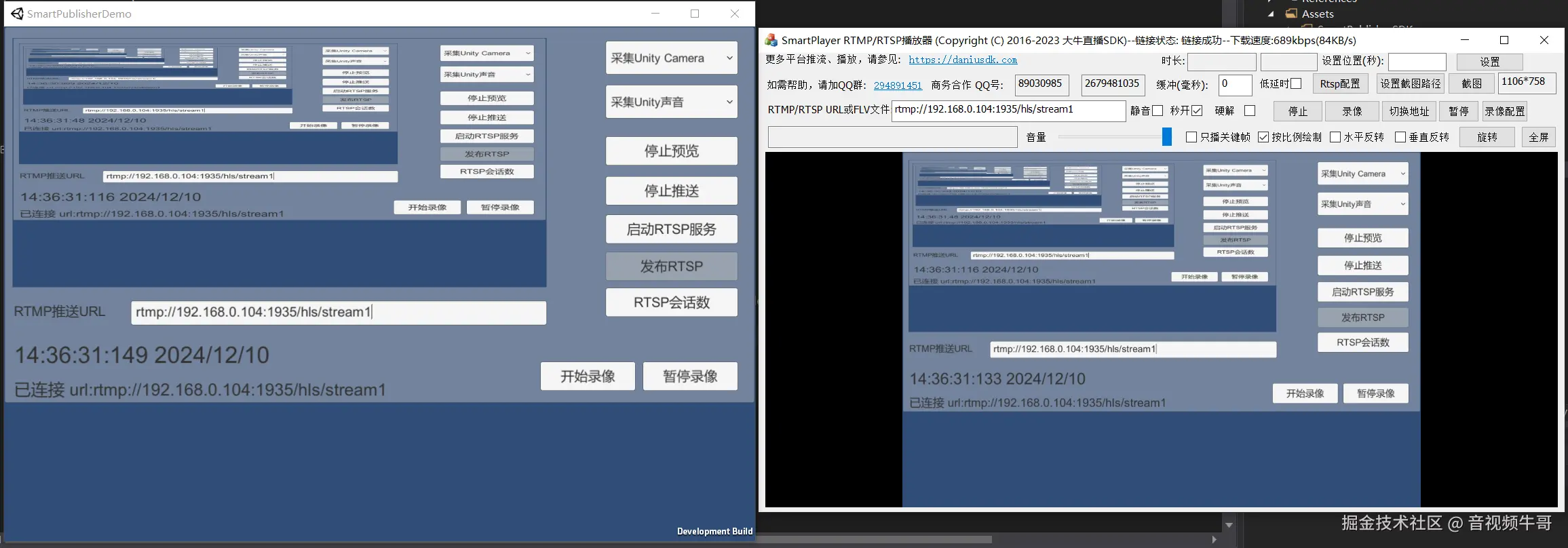 Unity下采集camera场景,然后本地预览(见推送端界面左上角回显部分),并采集camera场景的audio数据,推送到RTMP服务,并通过大牛直播SDK的SmartPlayer播放器播放,整体延迟效果如下: