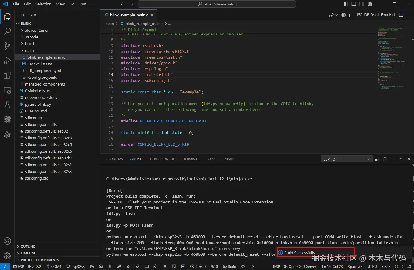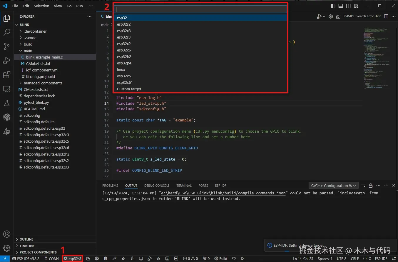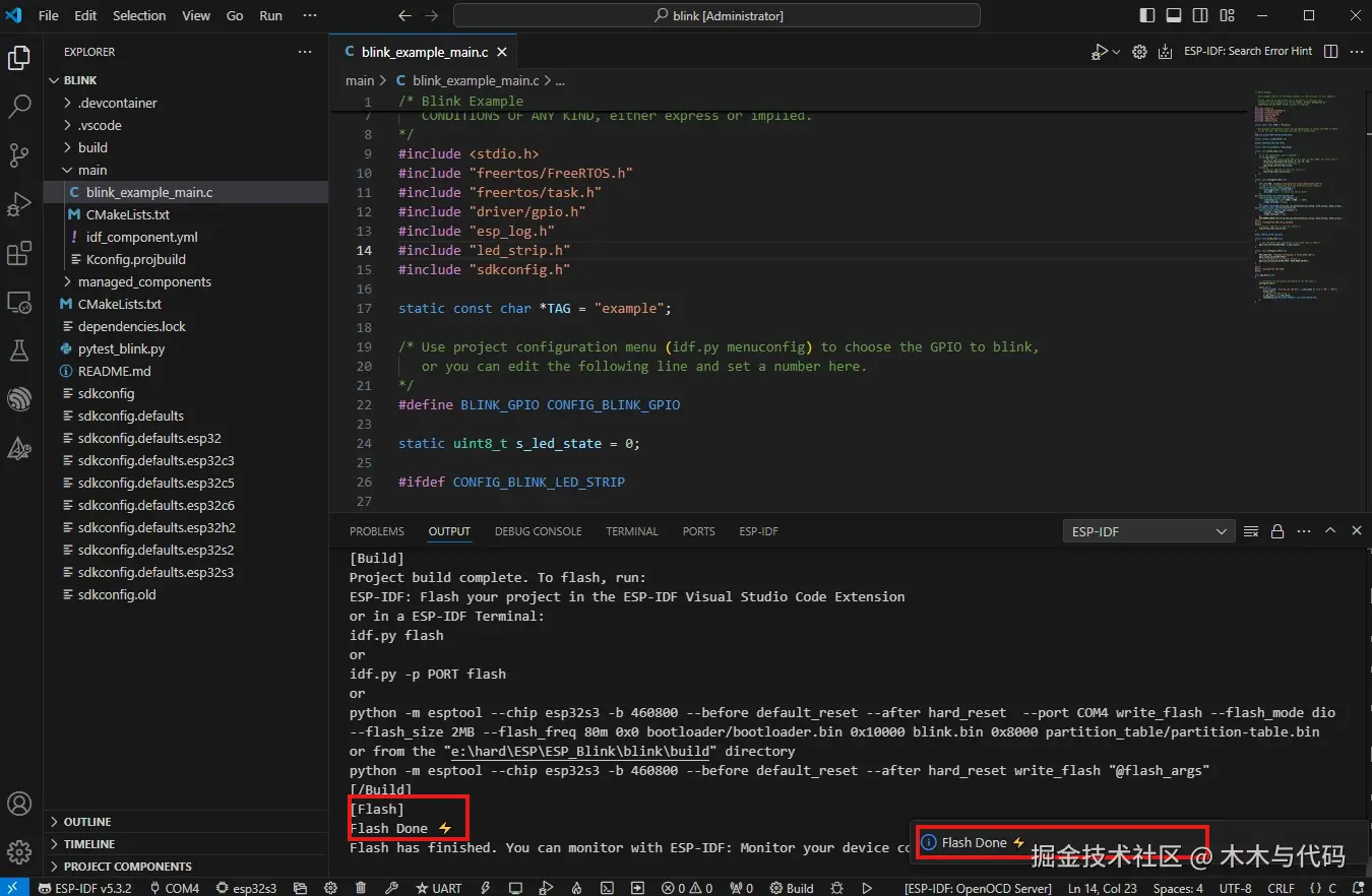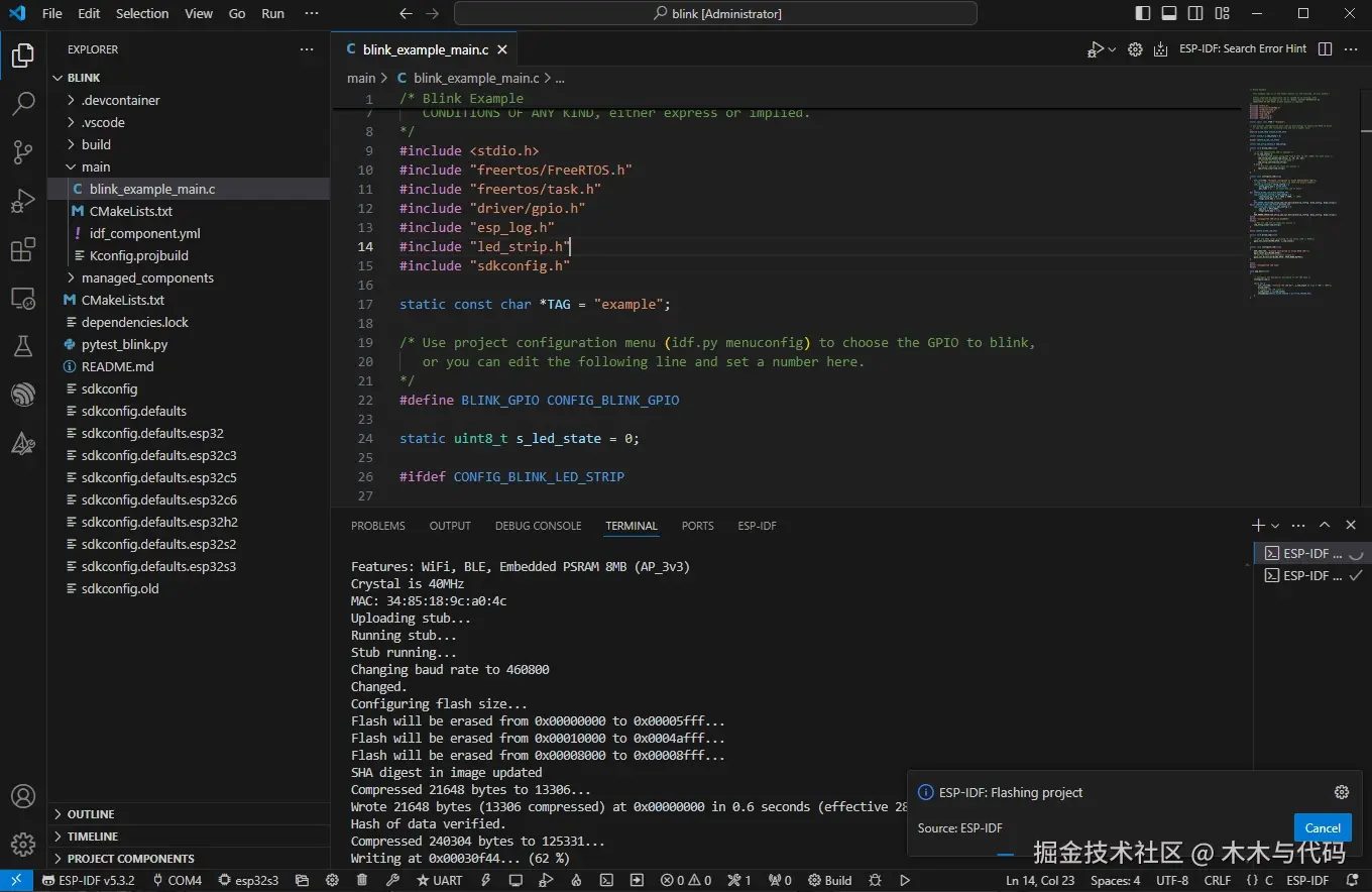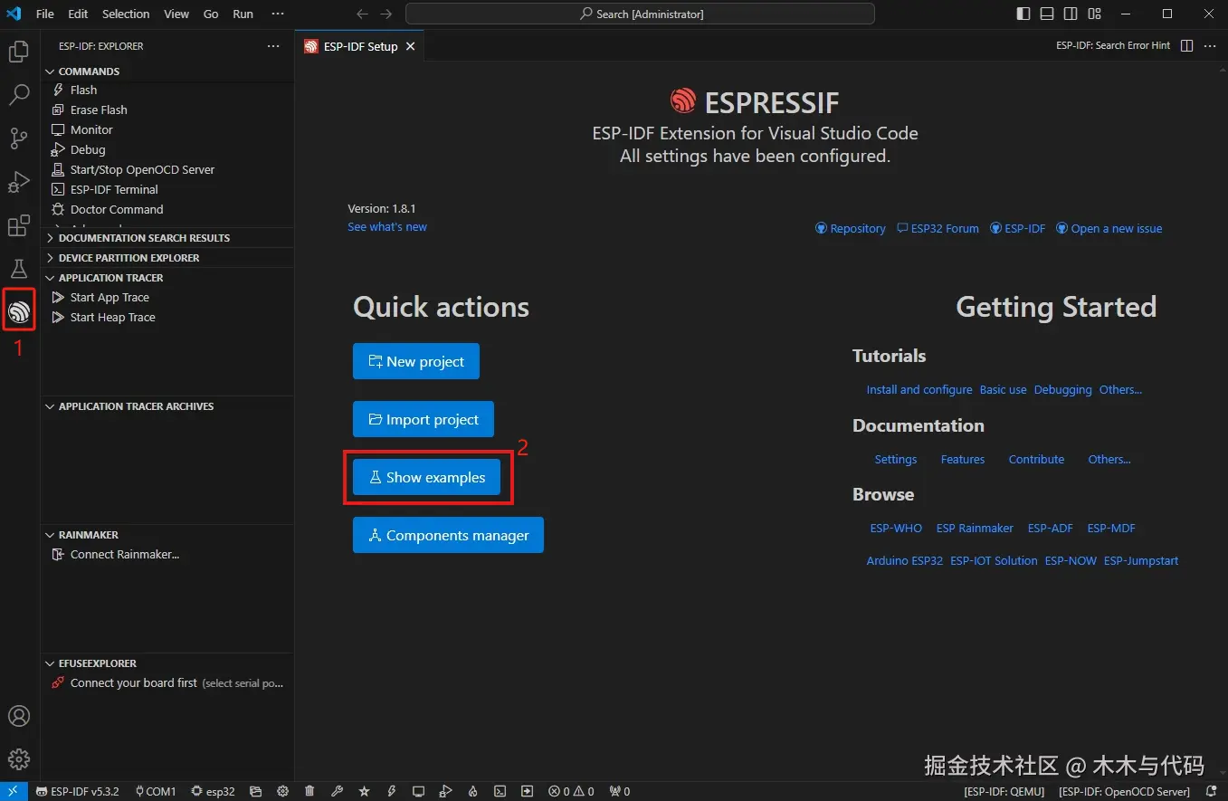 在VS Code中安装ESP-IDF插件,下载ESP-IDF环境SDK,创建项目验证。