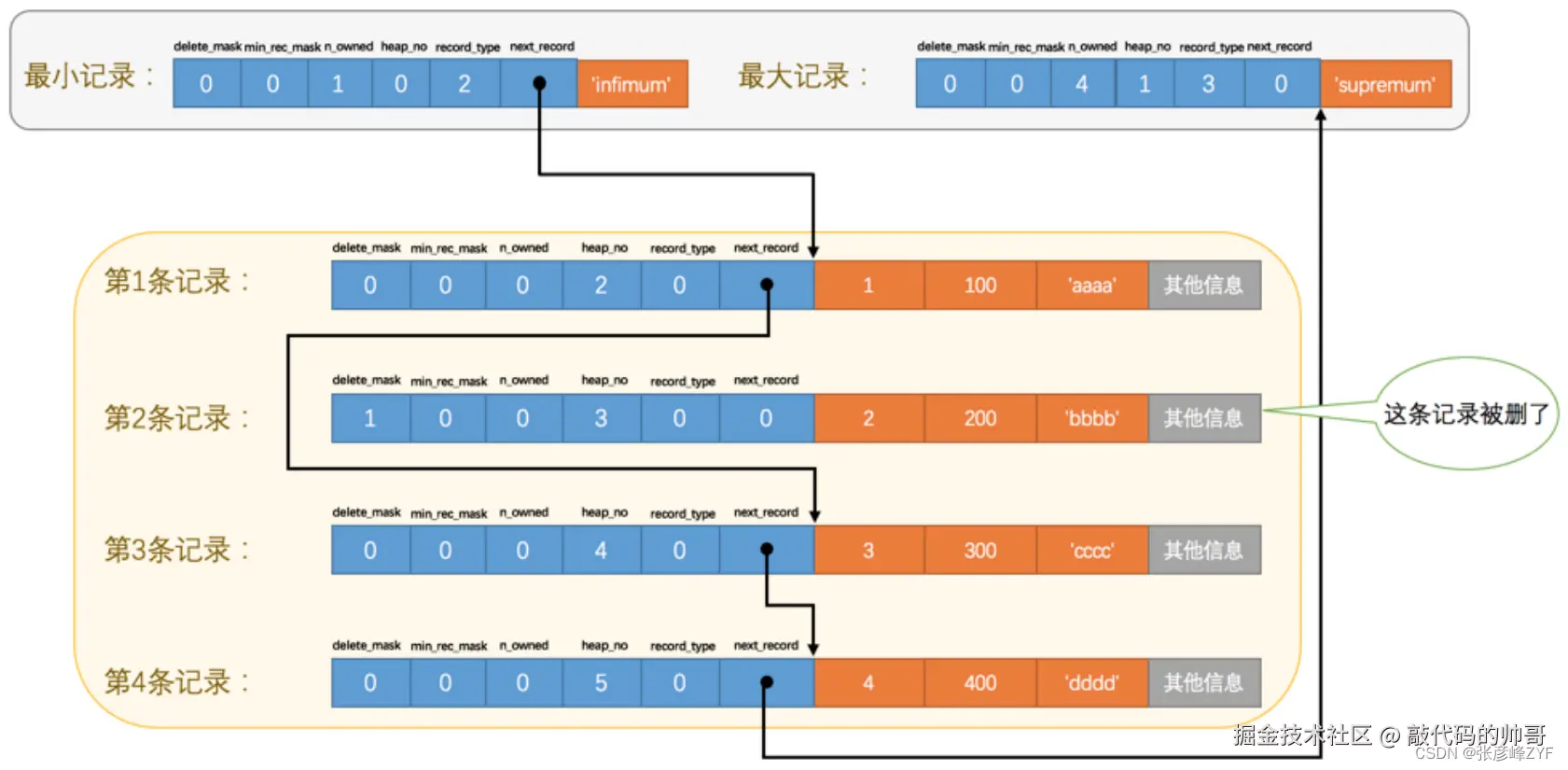 通过删除记录后的示意图,可以看到链表中的指针如何更新以维持链表的顺序和连续性。尽管记录 2 被标记为删除,它的空间可能会被重用,但链表的有序性不会受到影响。