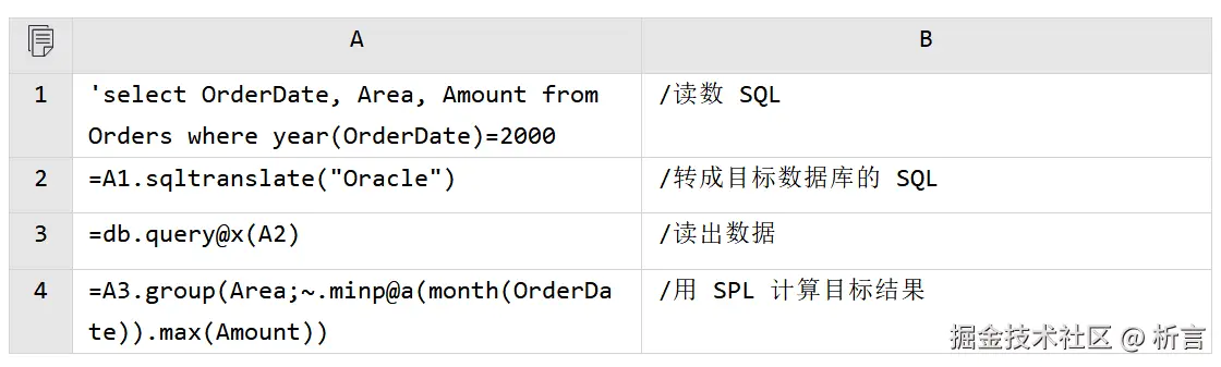 当计算需求复杂时我们会用到某些数据库特有的语法或函数。比如 Oracle 有个 KEEP 函数可以方便地计算每组的第一条 / 最后一条记录,其它很多数据库都没有。如果 SQL 语句中用到了这个函数,就不能再用上面的简单办法移植到其它数据库上了。这种情况下,我们可以只用基本的 SQL 读取数据,而把更复杂的运算交给 SPL 来做,SPL 是完全不依赖于数据库的,这样写出来的代码就可以继续拥有可移植性了。