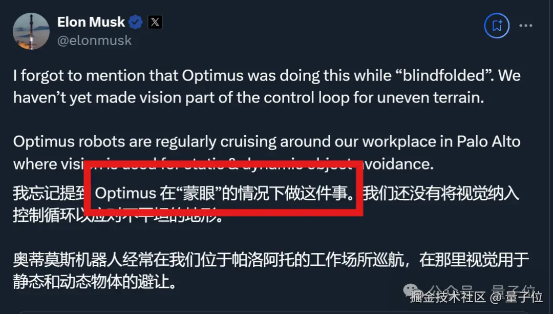 马斯克特别强调,本次更新的所有视频 Optimus 都是处于 “蒙眼” 状态,没有视觉摄像头等。