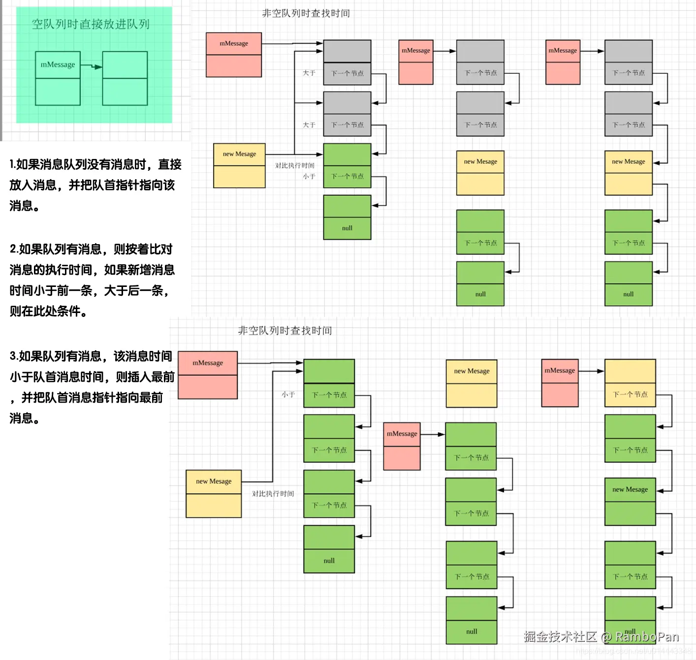 next()方法执行完成。 - 空队列时,第一条消息插入,并且该消息需要马上执行,那么按代码的逻辑,肯定是先返回该消息,此次