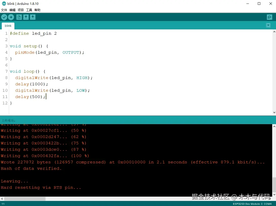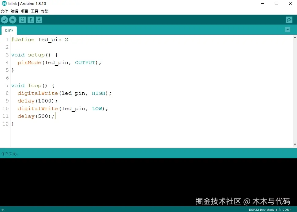 写一个经典的led灯闪烁程序测试在Arduino IDE中开发ESP32的效果:
