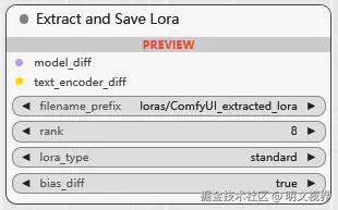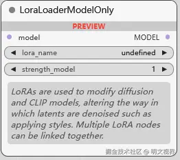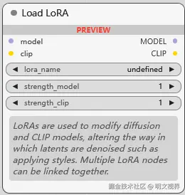 LoRA 模型加载器, 用于加载 Lora 模型, 它的作用是调节 扩散模型(基本模型) 和 CLIP 模型, 让生成结果向 LoRA 靠近. 多个 Lora 可以连接起来. 第 2,3 个参数用于调节基本模型和 CLIP 模型权重