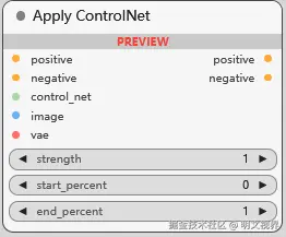 应用 ControlNet 模型, 接收正/负调节, ControlNet 模型, 图像, VAE. 可控制强度, 开始/结束时机