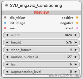 SVD 图生视频条件, 可指定视频宽/高, 视频帧数 video_frames (长度), 视频运动参数 motion_bucket_id , 每秒的帧数 fps, 以及视频增强水平 augmentation_level