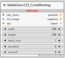 StableZero123 模型条件, 可指定宽/高, 一次生成数量, 3D 仰角 elevation, 3D 方位角 azimuth