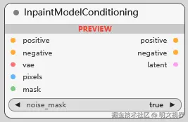 重绘模型调节 (用模型对图像进行修复/重绘), 参数 pixels 表示要进行修复的图像的像素数据, noise_mask, 控制噪声是否只在蒙版内产生.