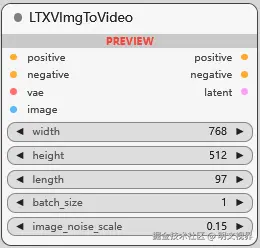 LTXV 模型图生视频条件. length: 生成视频的帧数, batch_size: 一次生成视频数, image_noise_scale: 添加到输入图像的噪声强度