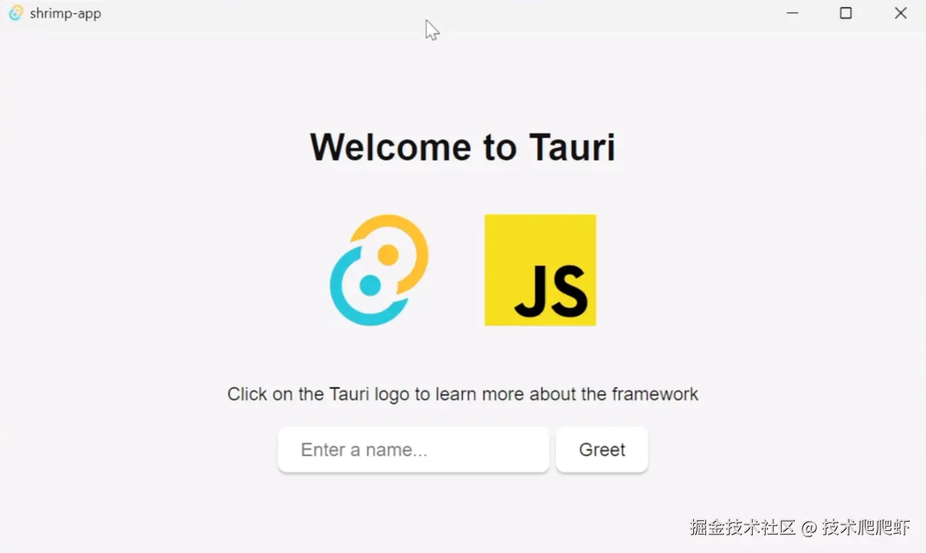 然后项目打开了一个全新的桌面应用,这个就是我们第一个Tauri的APP了。我们可以在这里面随便填上一个名字,然后点击greet,下面弹出了一句输出。