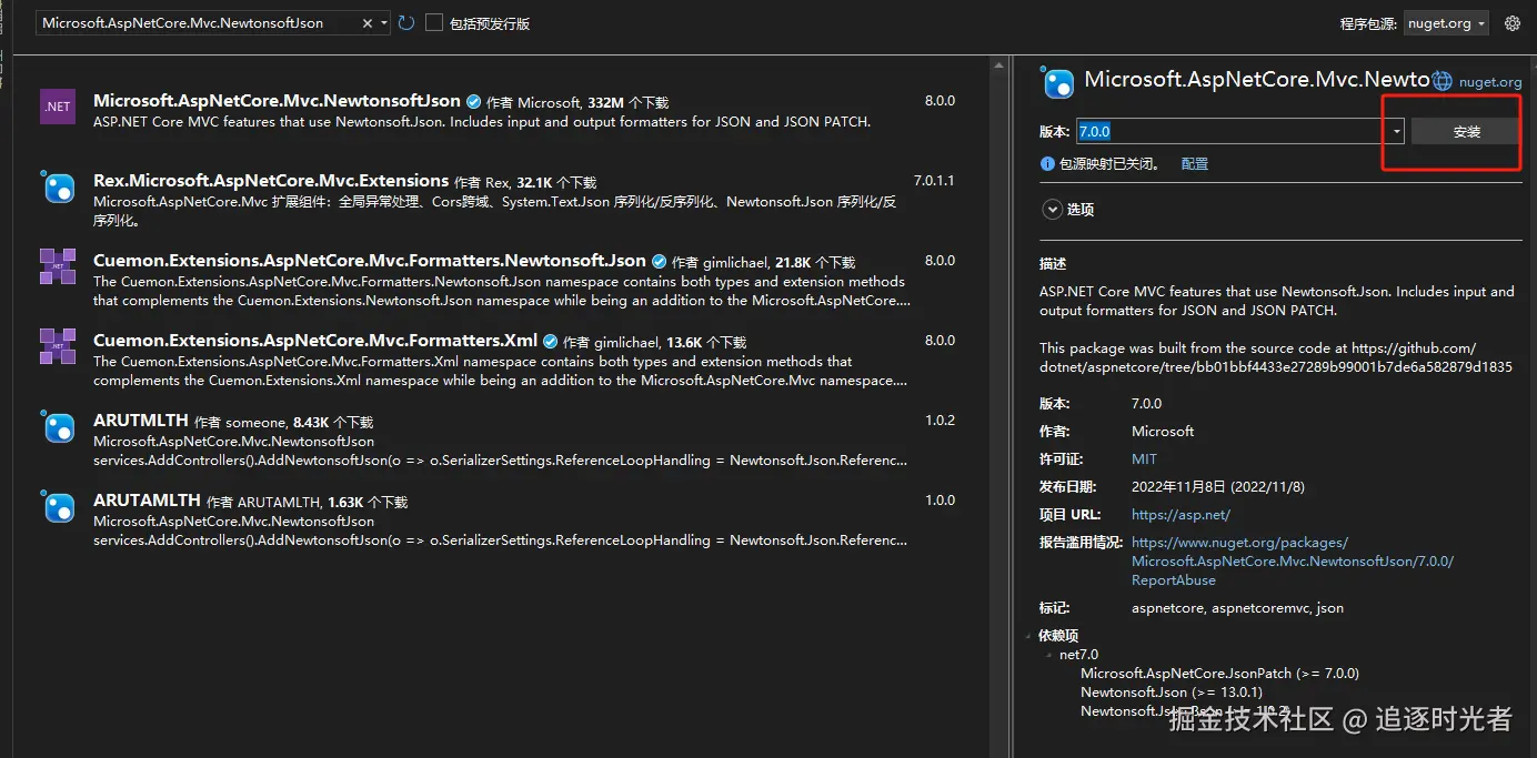 在.NET 3.0及其以上的版本使用Newtonsoft.Json需要通过安装 Microsoft.AspNetCore.Mvc.NewtonsoftJson 包来进行配置(注意假如提示该包安装失败可以尝试安装其他版本的包)。