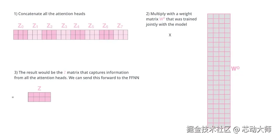 但是后面的全连接网络需要的输入是一个矩阵而不是多个矩阵,因此我们可以把多个head输出的Z按照第二个维度拼接起来,但是这样的特征有一些多,因此Transformer又用了一个线性变换(矩阵𝑊𝑂)对它进行了压缩。这个过程如下图所示。