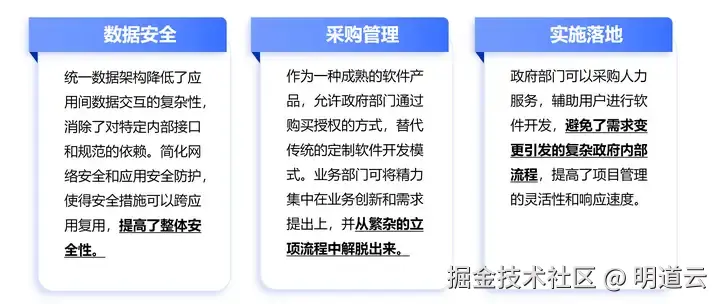 在政务部门眼中,零代码技术本质类似软件(如 WPS),有以下三大优势: