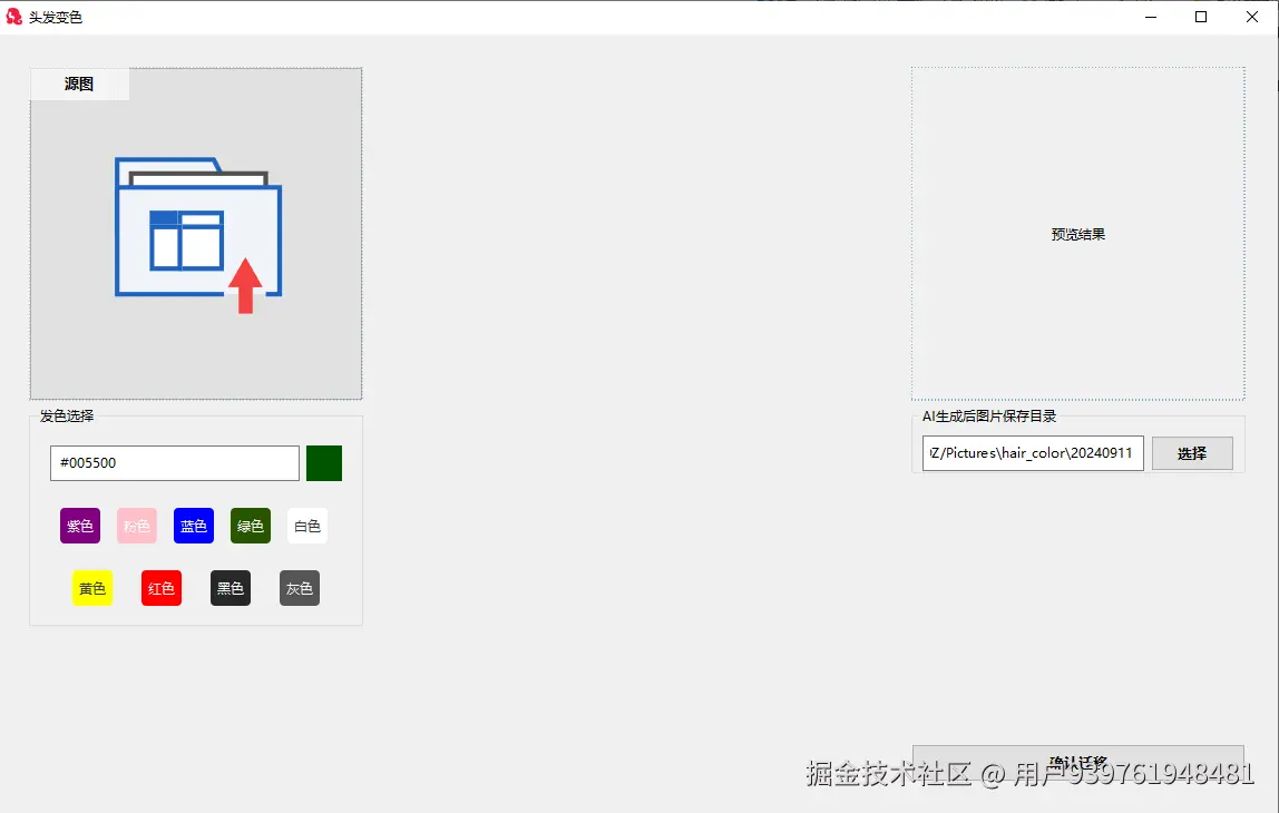 应用启动之后,我们就可以上传图片进行发色融合了。发色默认是绿色,也可自己选择,目前提供了9中可用发色,日后会不断更新,提供更多的发色,有兴趣的可以关注我们的公众号,方便日后查看更新动态。
