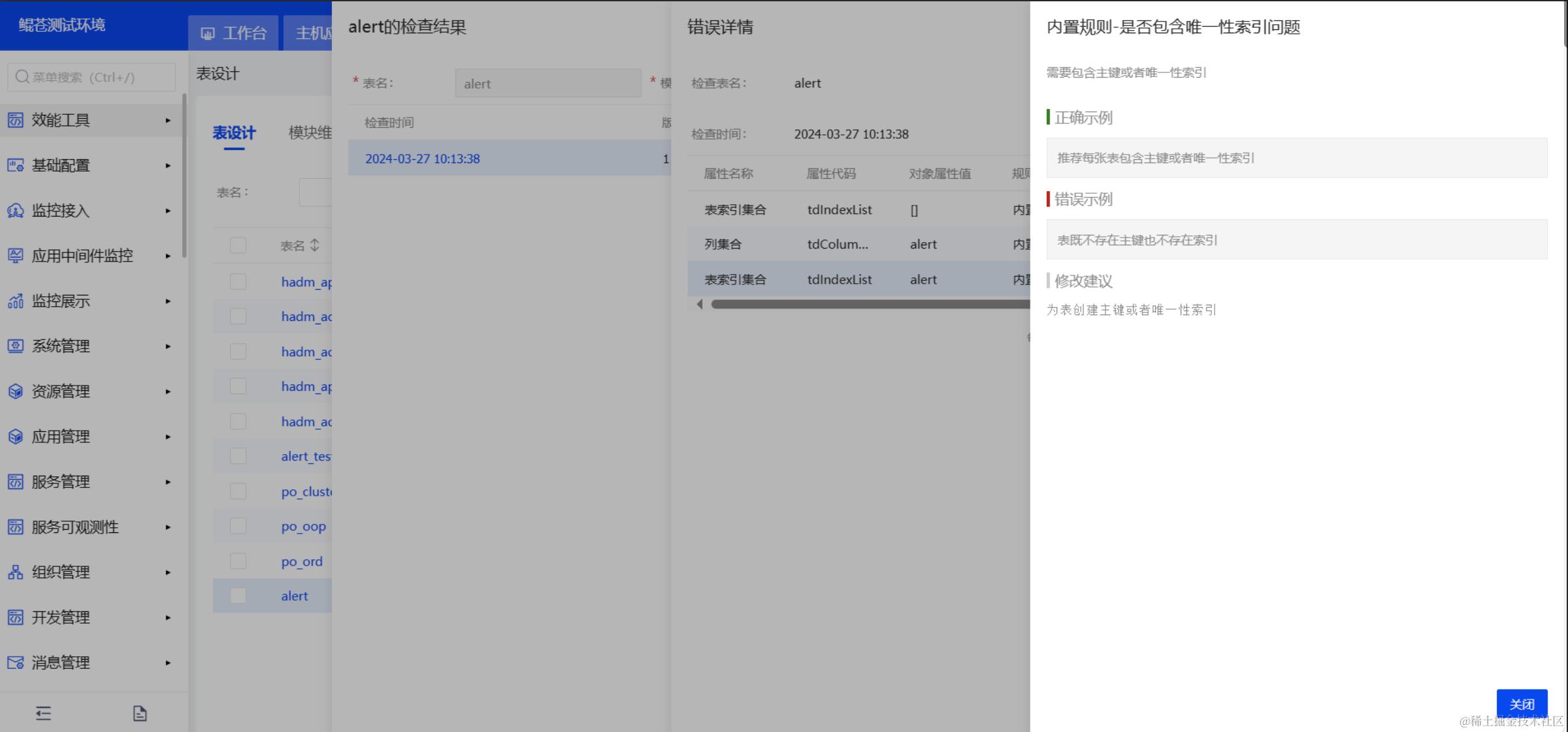 设计完毕后可保存并提交,提交操作会触发表设计检查。系统内置强大且灵活的表结构检查规则,同时支持自定义表结构检查规则,有效保持整个团队设计的一致性。例如: