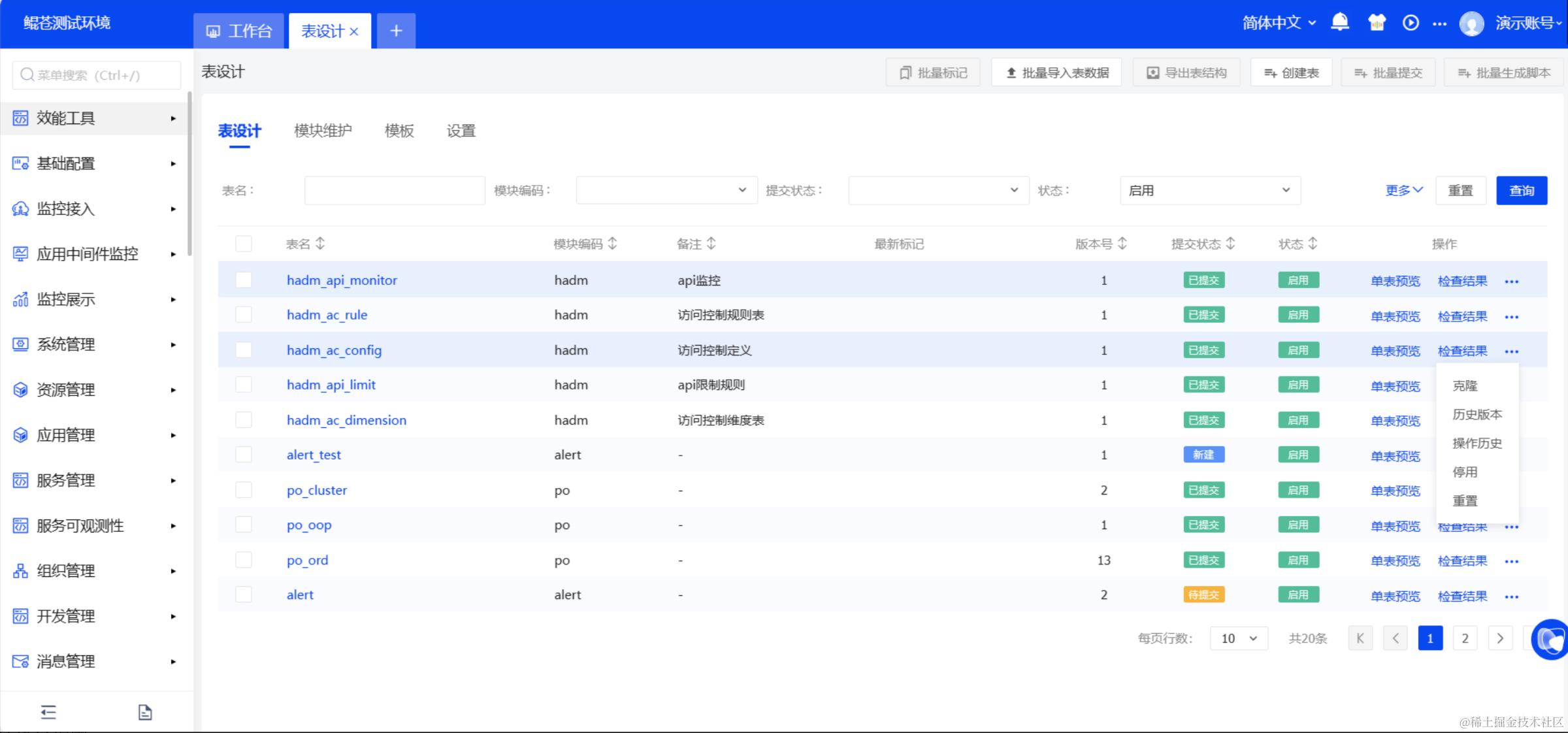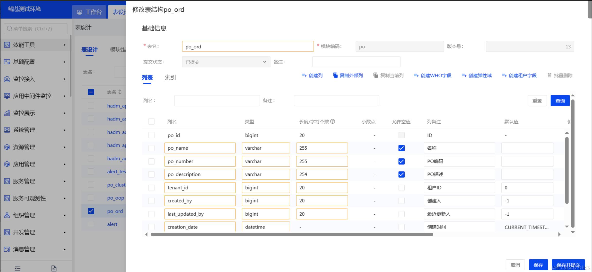 根据业务需求进行表设计,包括字段设计和索引设计。根据实际情况对表结构进行升级调整(日常维护),表设计工具会记录完整的升级过程。支持创建/复制列,一键创建WHO/弹性域/租户等常用字段,以及支持批量删除等快捷操作。