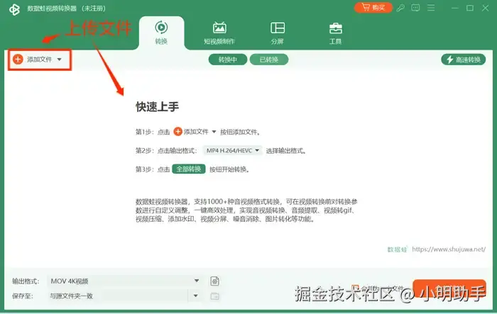第二步: 点击首页左上角的【添加文件】或者操作指引界面的任意处上传需要进行转换的视频(可批量上传)。