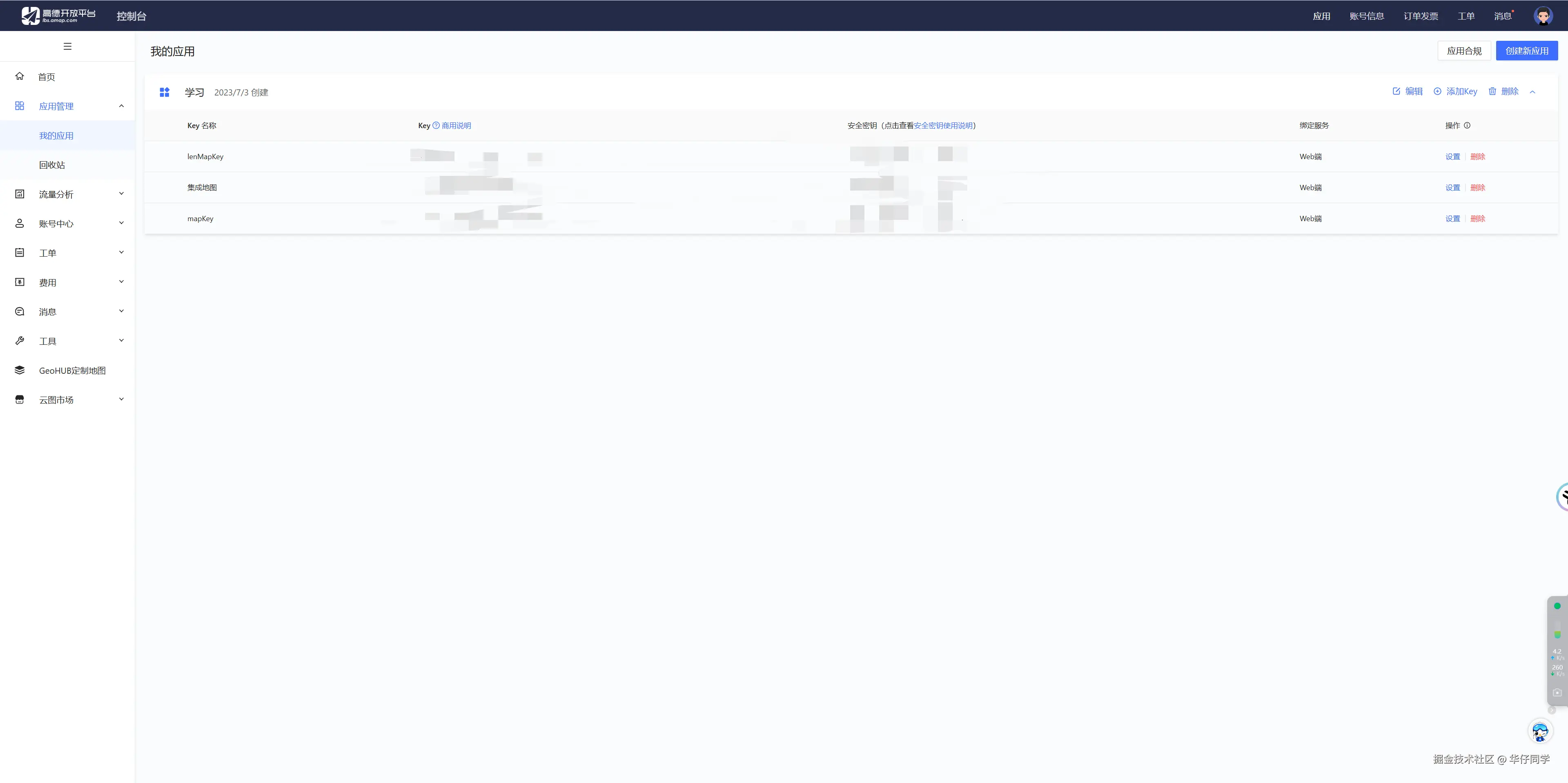 之后选择应用管理---我的应用,选择添加key