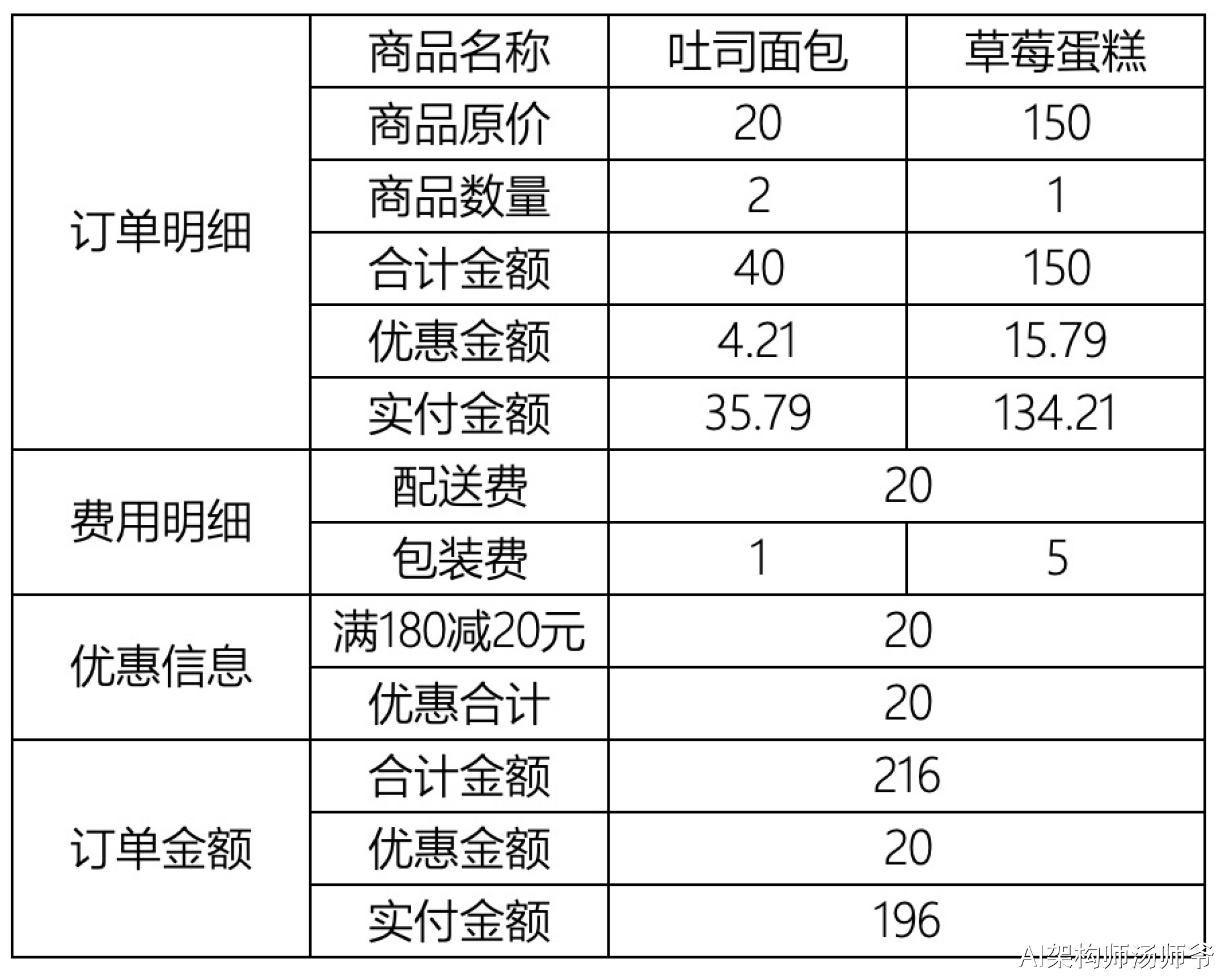 分摊完成后,订单金额为 216 元(商品 190 元 + 配送费 20 元 + 包装费 6 元),减去 20 元优惠,顾客实际支付 196 元。