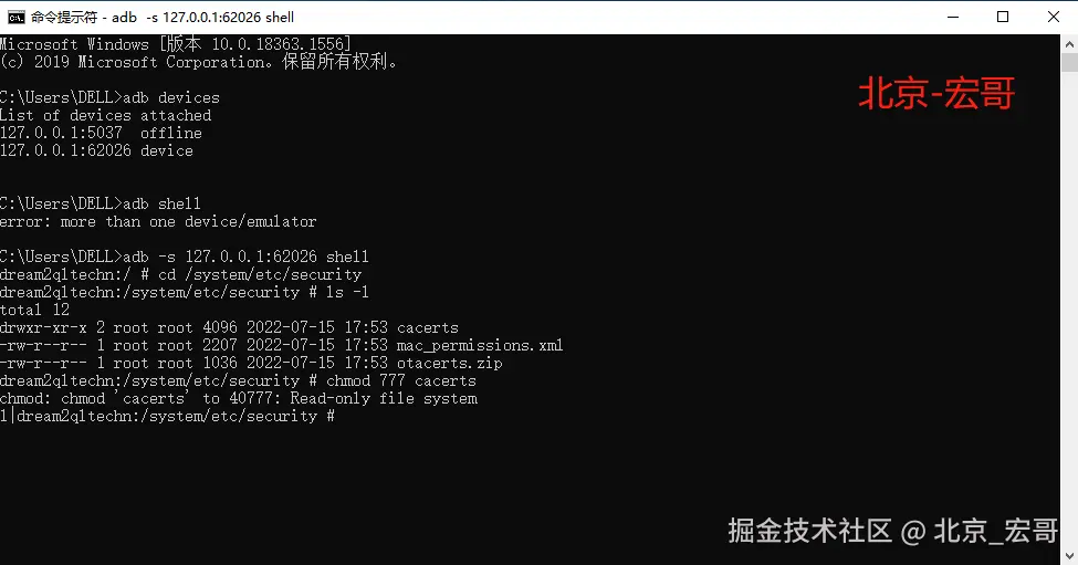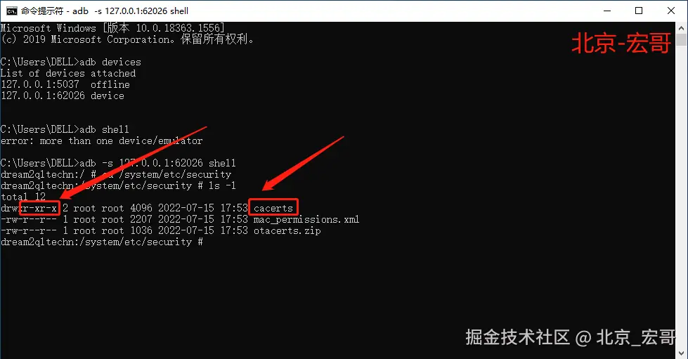 4.cmd 输入 cd /system/etc/security, 然后输入ls -l, 可以看到cacerts目录,我们只有读与执行权限,并没有写入的权限。如下图所示: