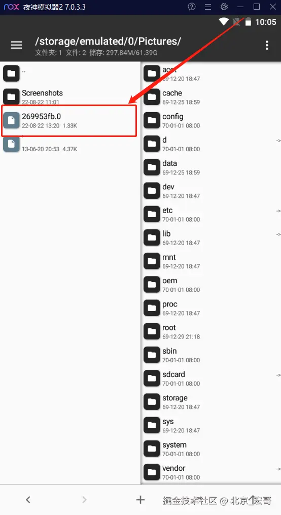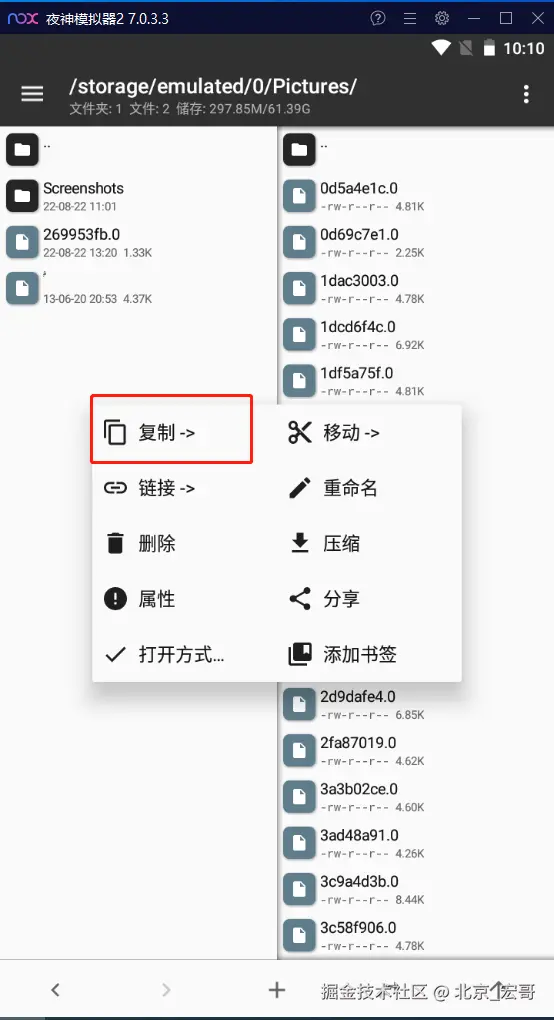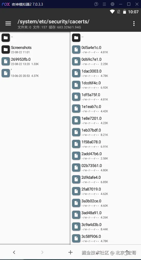3.下载MT管理器,下载地址:coolapk.com/apk/bin.mt.… 。拖拉到模拟器中安装完成,点击打开应用,左边打开Pictures目录就可以看到刚才电脑ImageShare目录的Fiddler证书269953fb.0