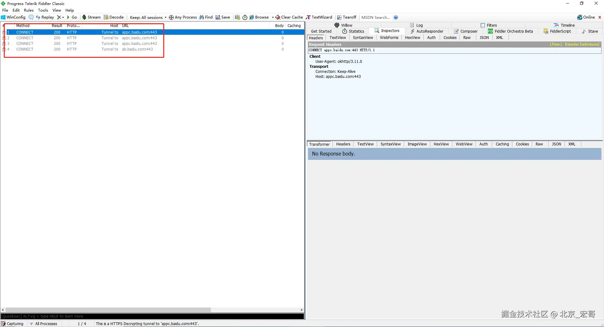5.Fiddler抓包结果:Fiddler中可以看到大量的CONNECT然后就没有下文了。如下图所示: