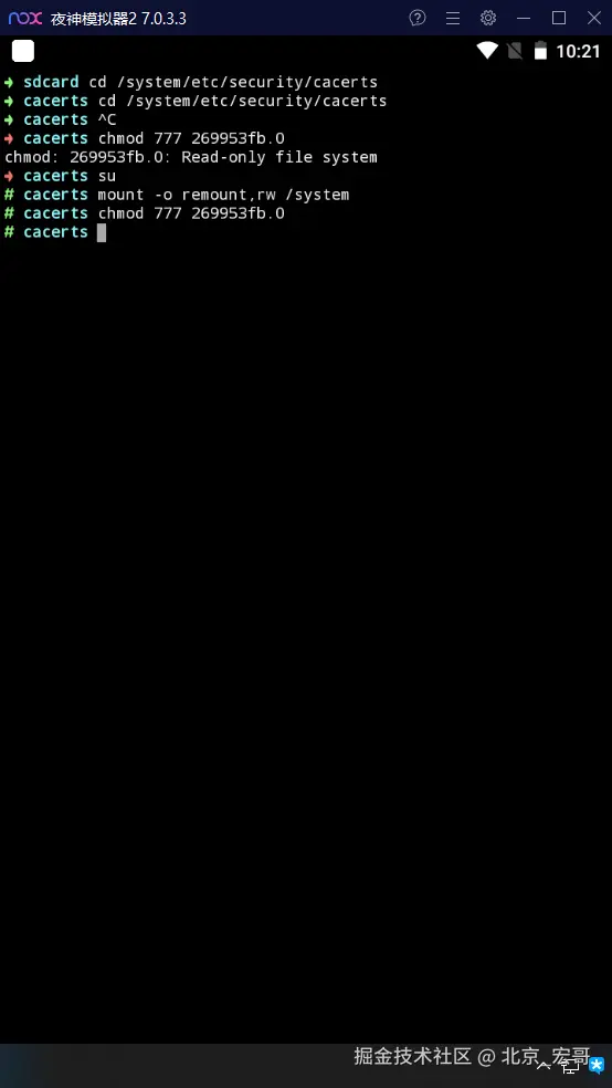 有些小伙伴可能在其他模拟器输入chmod 777 cacerts,会被提示Read-only file system。如下图所示: