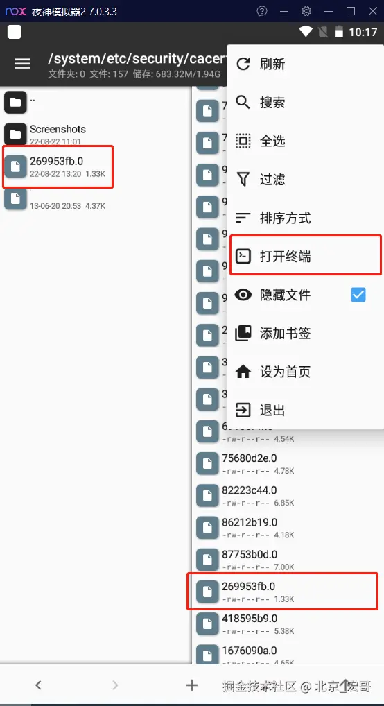 5.一般人到这里以为就结束,但是你留意看一下刚才复制到system/etc/security/cacerts目录下的269953fb.0文件,你会发现跟其他已有的系统证书相比,269953fb.0根本就没有读的权限,到时你到信任的凭据也是没法找到这个Fiddler证书的,点击MT管理器的左上角,找到打开终端