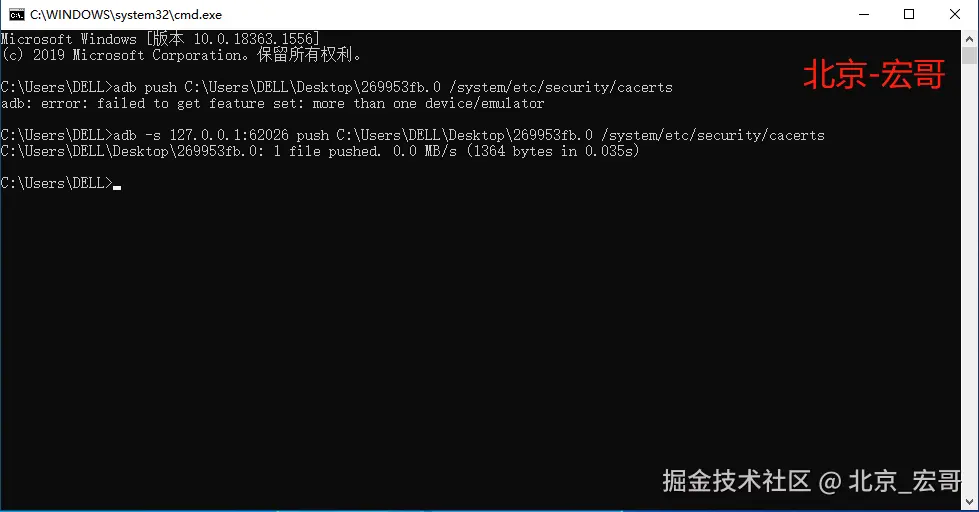 6.输入exit退出shell终端,然后输入adb push C:\Users\DELL\Desktop\269953fb.0 /system/etc/security/cacerts(同样道理需要指定模拟器),将事先转换好的Fiddler证书推送到夜神模拟器的/system/etc/security/cacerts目录下。如下图所示: