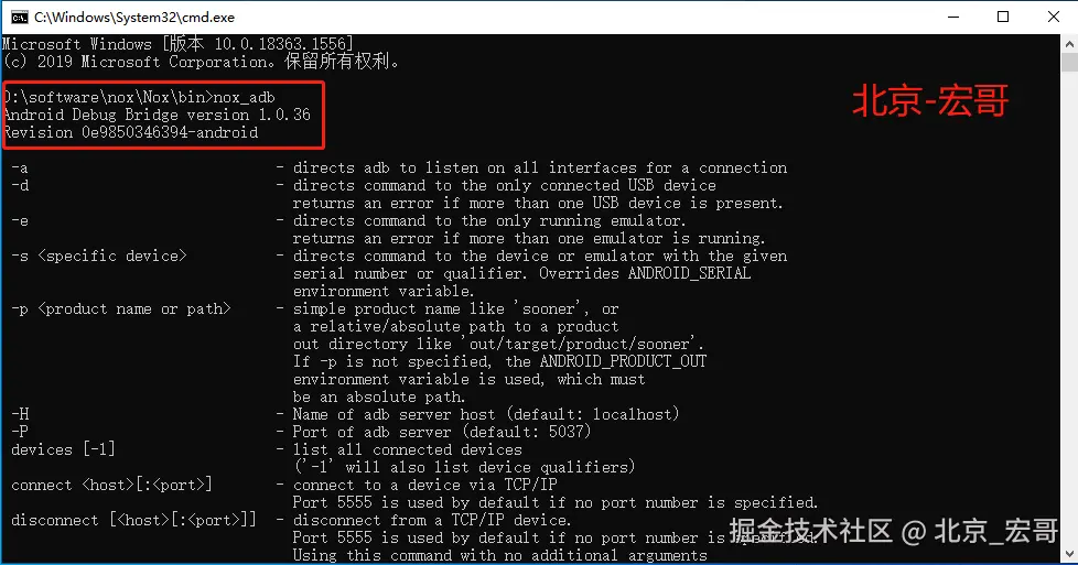(3)然后在上一步中的目录地址栏输入cmd进入命令行,然后输入nox_adb,看到模拟器中的adb版本是36