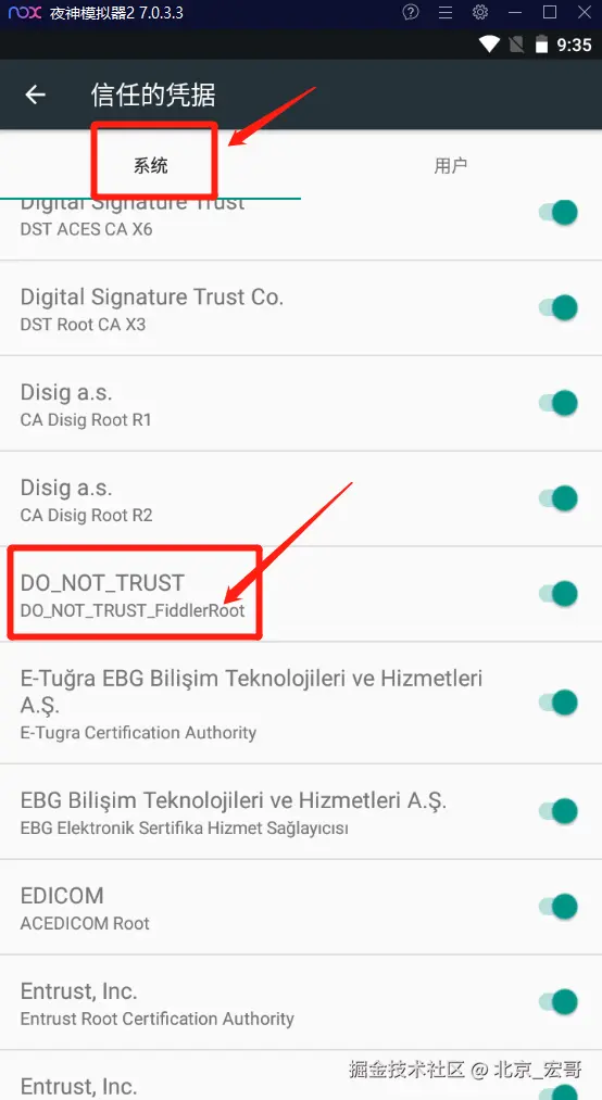 要想从根本上解决问题,我们找到根源从跟上解决问题即可!究其根源,targetSdkVersion >= 24的应用在android 7.0+系统的设备中之所以没法被抓包,是因为android 7.0之后的应用是默认只信任系统证书,不信任用户证书,那么我们可以想办法将Fiddler证书装到系统证书目录下,伪装成系统证书,那么就不存在因为fiddler证书不被信任而无法抓包的问题了。找到根源了,既然是用户证书不被信任,那么我们制作一个系统证书安装在手机上你就解决这一问题了。接下来宏哥就按这个思路解决问题。