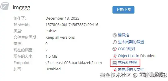 在backblaze里面选择要备份的桶,点击Make Full Bucket Snapshot创建一个快照