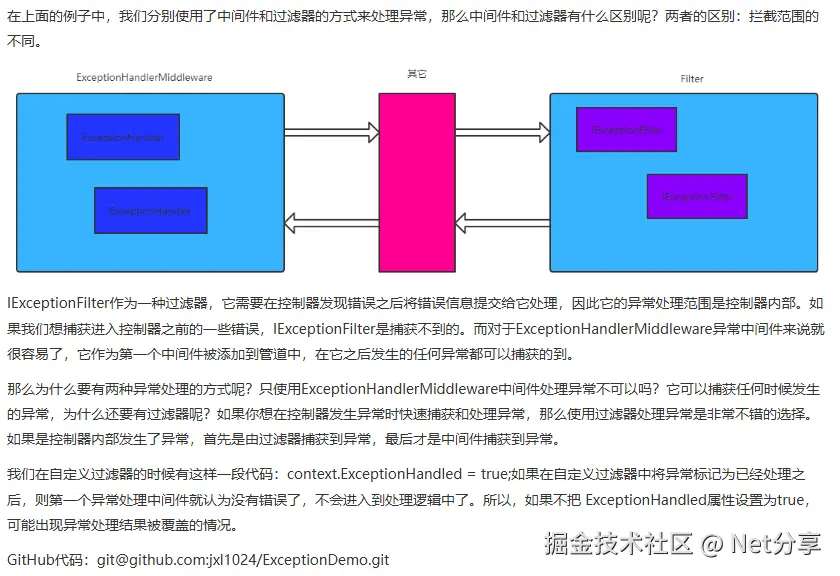 在ASP.NET Core MVC中,异常过滤器(Exception Filters)和异常中间件(Middleware)都可以用来处理异常,但它们在请求处理管道中的位置和用途有所不同。