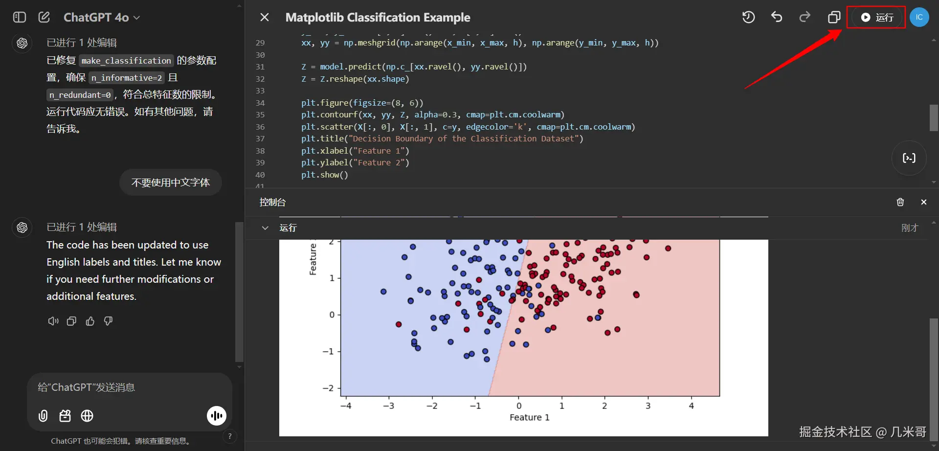 如下图所示,ChatGPT自动生成了一个Matplotlib的例子用来展示分类算法的可视化结果,这就比之前只能让用户自己复制粘贴到其他的IDE里面要方便了许多。