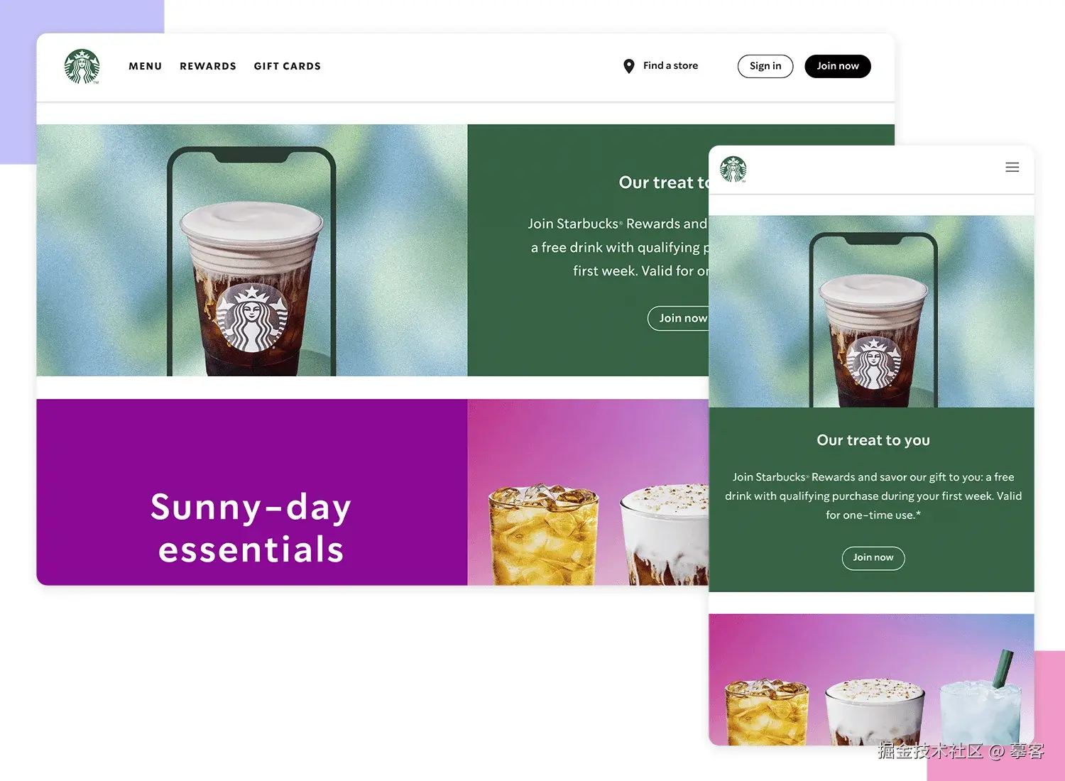 星巴克是一个很好的响应式设计范例,视觉上简单、醒目又没有花哨的视差,但又通过色彩鲜艳的季节性产品图片有效传达了品牌形象,呈现出一种既直观又富有活力的设计。