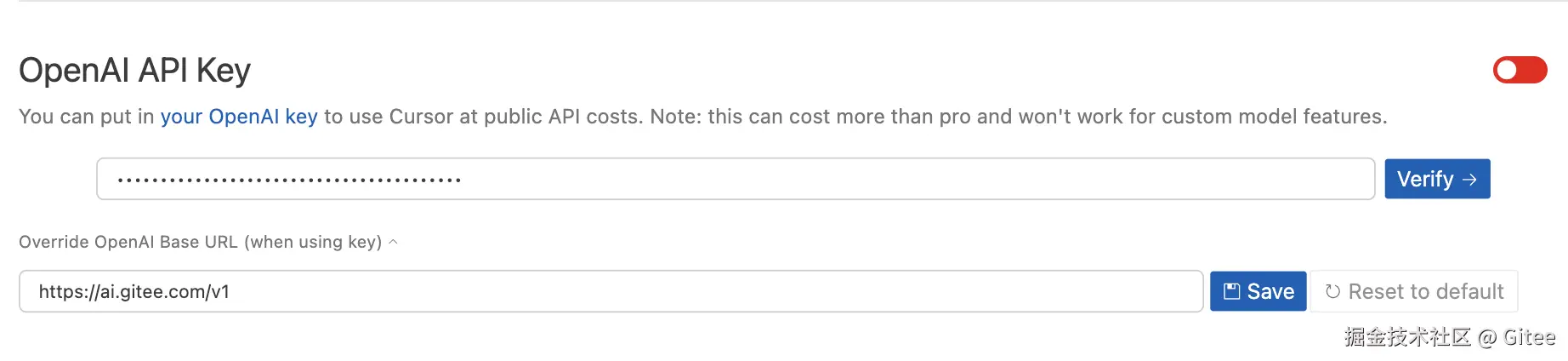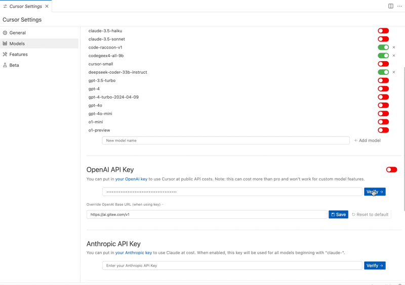 点击Verify按钮,如OpenAI API Key右侧按钮变为绿色则为验证成功,你就可以在 Cursor 中尽情使用 Gitee AI 资源包了。
