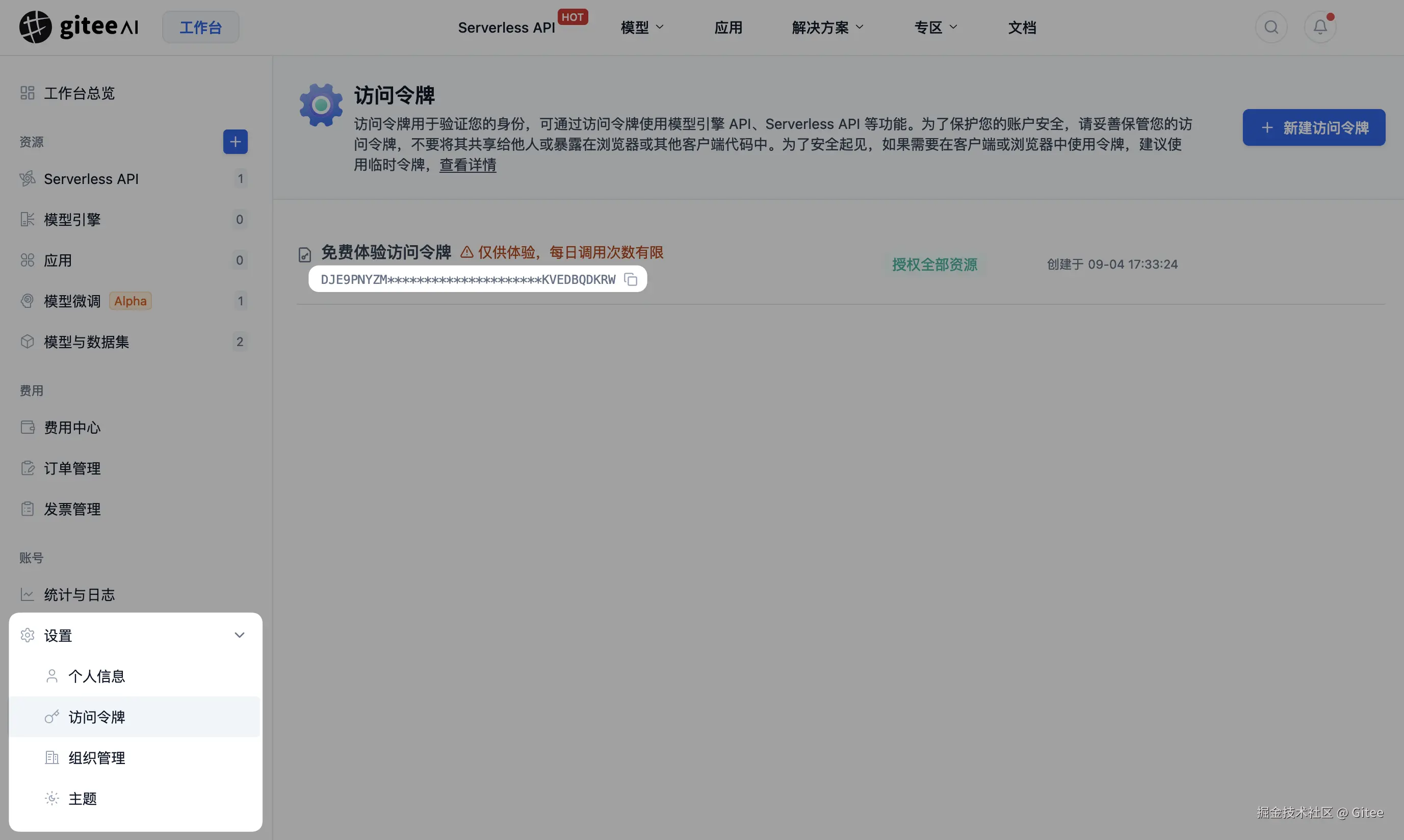 进入 Gitee AI 个人工作台,创建一个新的访问令牌(或使用已有且可用的访问令牌,本文以免费体验访问令牌为例)。